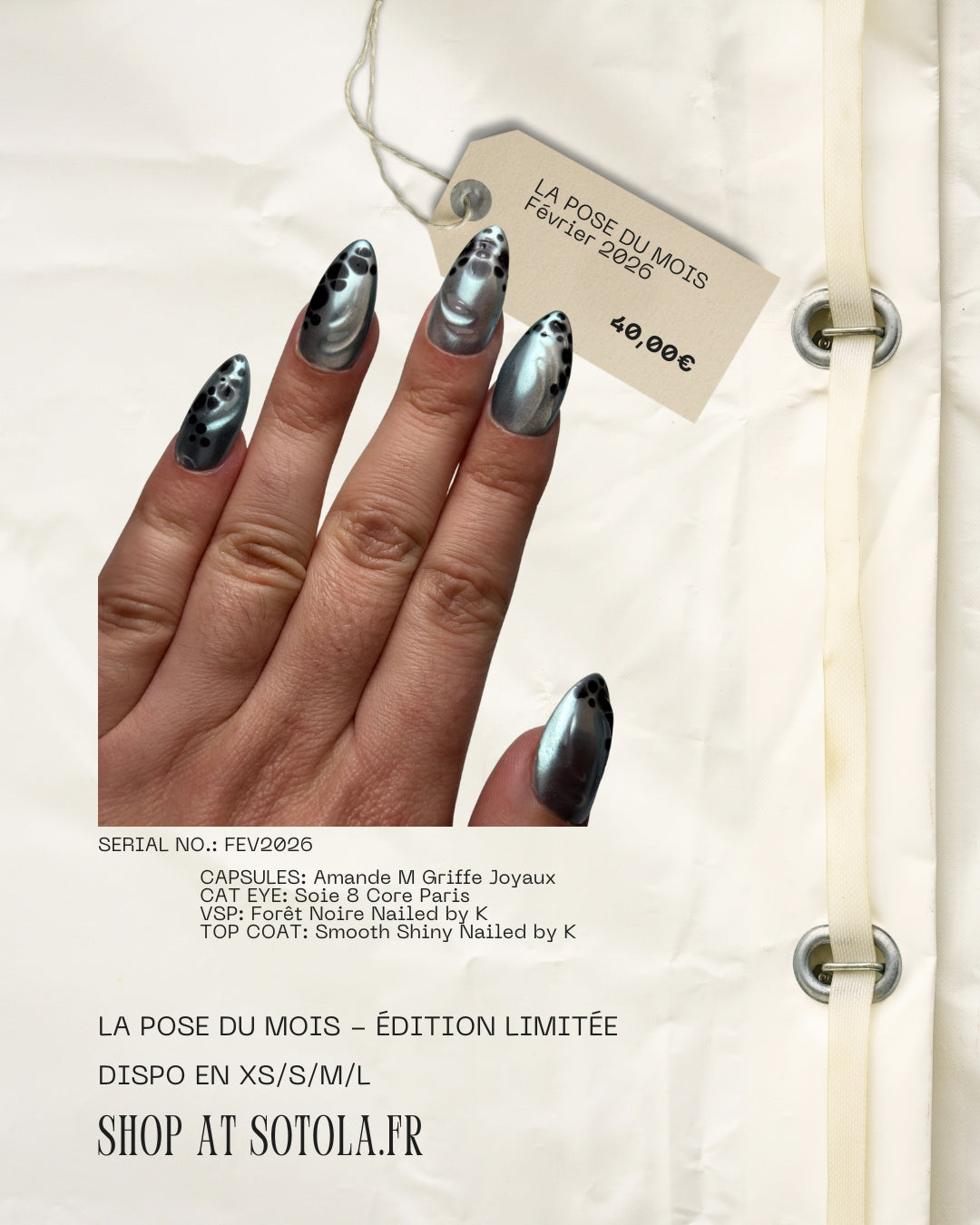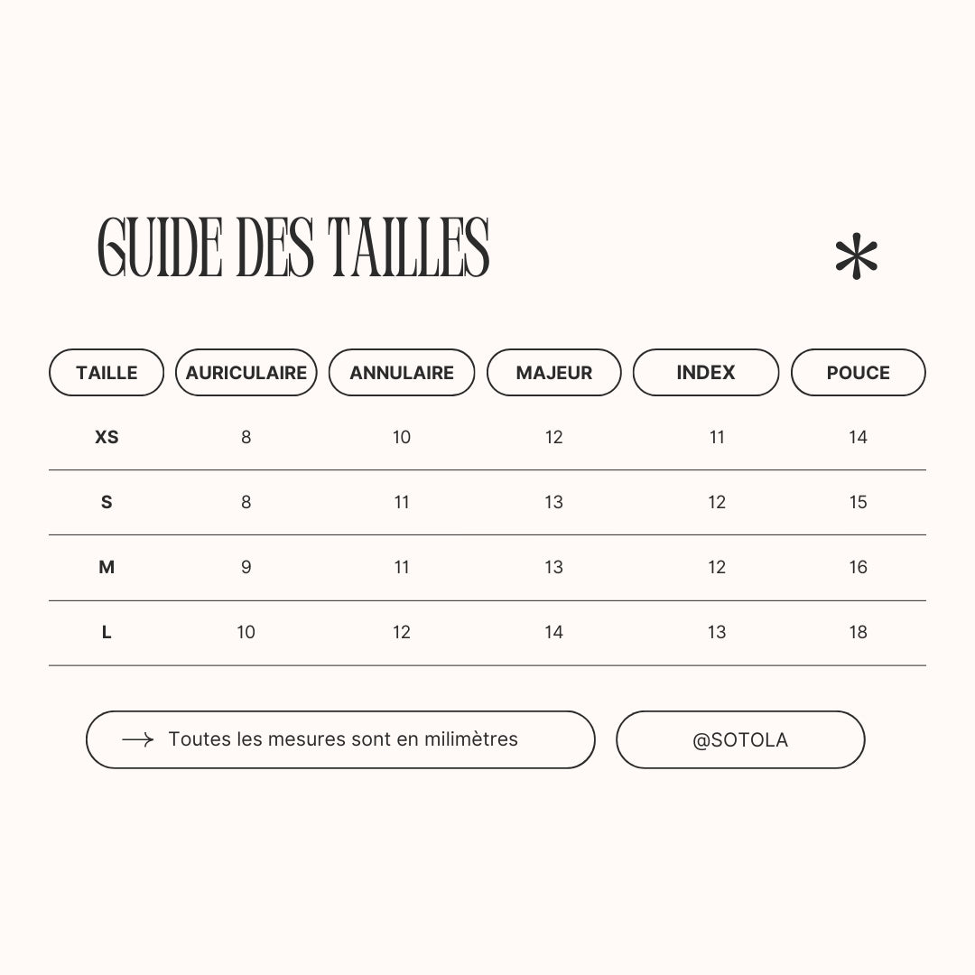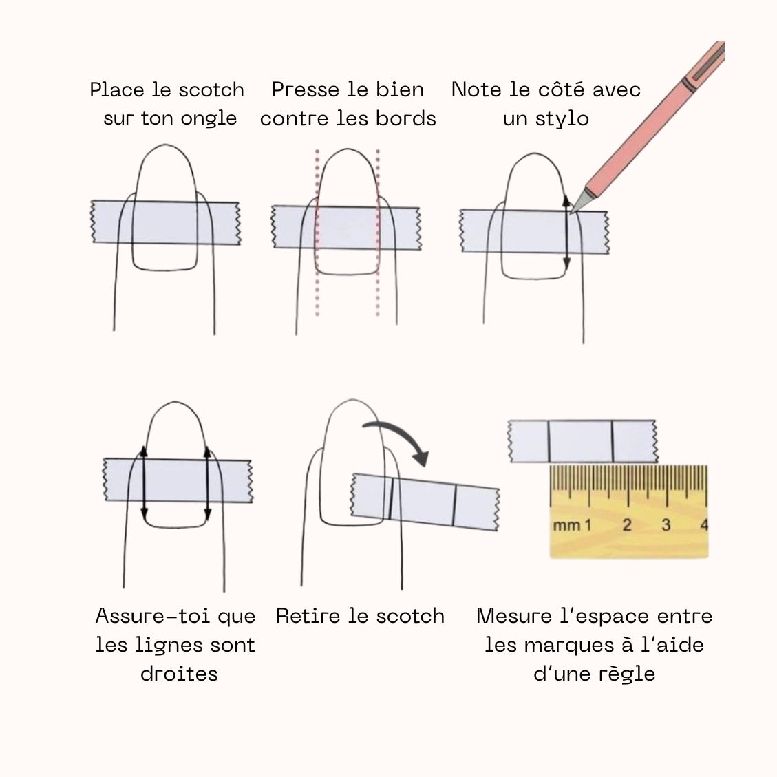 Reproduit ce système pour chaque ongle et tu obtiendras tes tailes ! Réfère toi à notre guide de taille pour choisir celle qui te convient. Si tu as un doute, prends toujours la taille au dessus :)